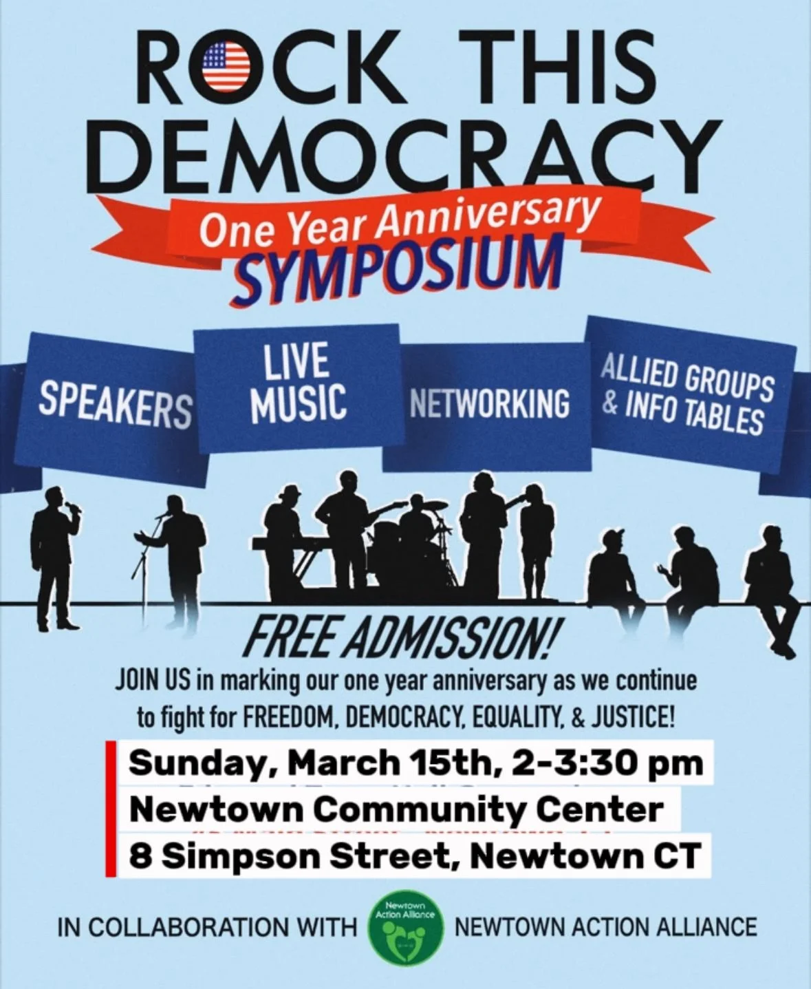 Newtown Action Alliance invite you to attend a free public event on Sunday, March 15th at 2 pm to mark the one year anniversary of Rock This Democracy. The symposium will feature live band B.A.R. (with Chris Daly, Tj Croke, Conor Brennan, and Chris Arnone), noted speakers, artwork, information tables from various groups, and the opportunity to network for action together!